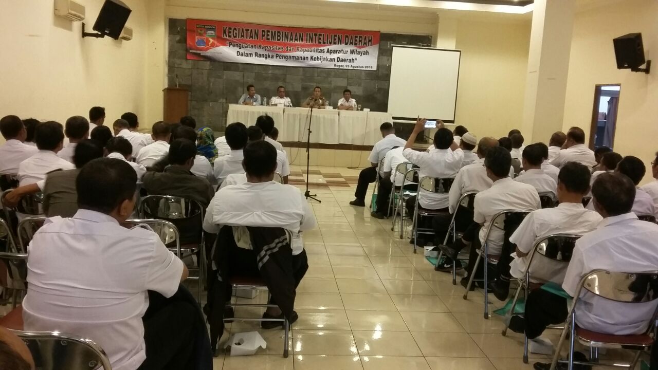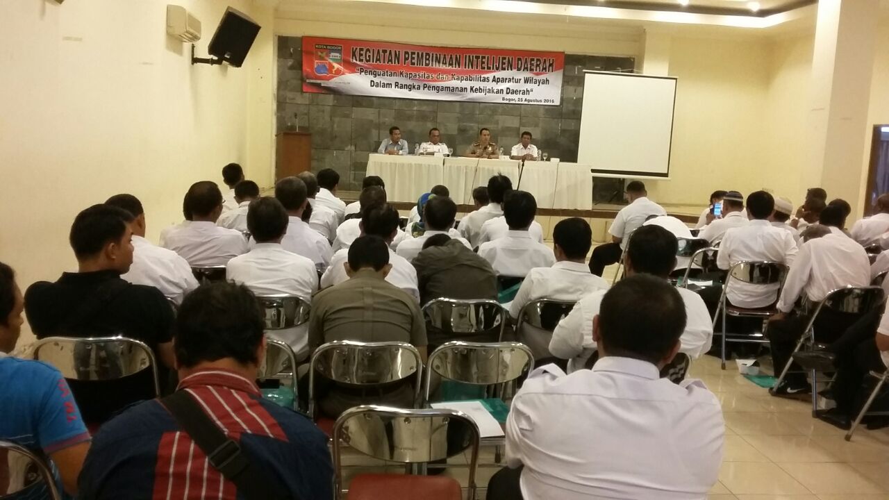 bertempat di Gedung Chrysant Harmony Banquet Halls Jl. KH. Abdullah Bin Nuh Kel. Curug Mekar diselenggarakan kegiatan pembinaan Inteljen daerah yang diberi tajuk “Penguatan Kapasitas dan Kapabilitas Aparatur Wilayah dalam rangka pengamanan kebijakan daerah”