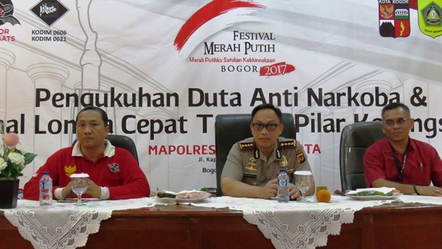 Dalam rangka Festival Merah Putih 2017 di wilayah Kota Bogor, Sat Narkoba Polresta Bogor Kota bekerjasama dengan Bogor Bersahabat (Bobats) memprakarsai kegiatan Pengukuhan Duta Anti Narkoba.