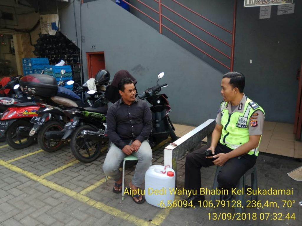 Polresta Bogor Kota – Kamis, 13-09-2018 Melaksanakan tatap muka dengan *Sdr.Masta, 38 th, petugas parkir , warga Rt 04/10 Kel. Sukadamai* dalam rangka menyampaikan pesan kamtibmas utk selalu waspada saat bekerja sbg tukang parkir, awasi betul keluar masuk orang dan kendaraan ke area parkir, himbau pemilik mobil utk tdk menyimpan barang berharga dan tas didalam mobil saat parkir.