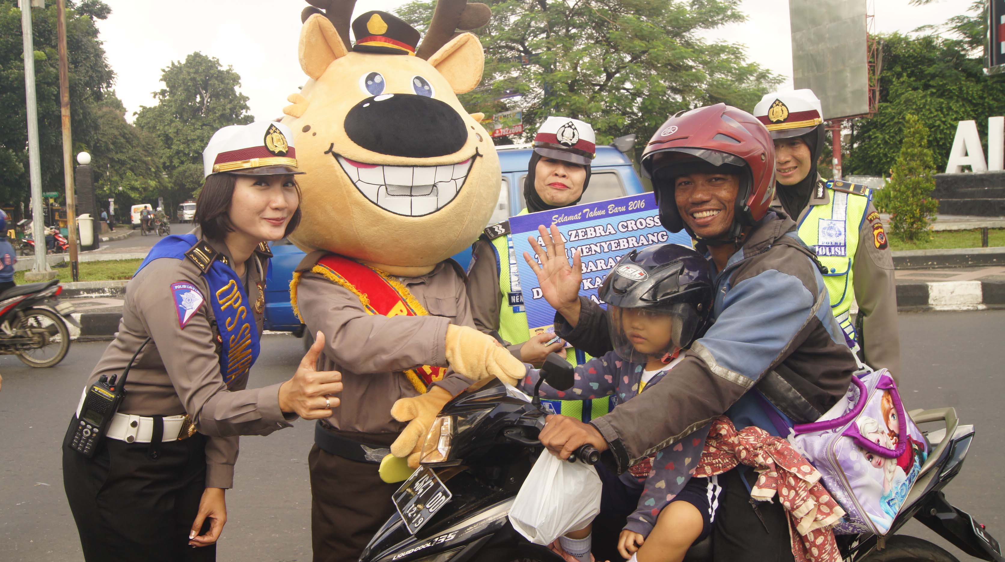 Maskot yang mengusung kearifan lokal kota Bogor yaitu rusa totol, ikut berpartisipasi membagikan Cokelat, permen dan Snack kecil yang berisi himbauan tertib lalu lintas kepada masyarakat, sembari sesekali melambaikan tangan kepada para pengguna jalan khususnya anak-anak kecil yang dibonceng oelah orang tuanya.