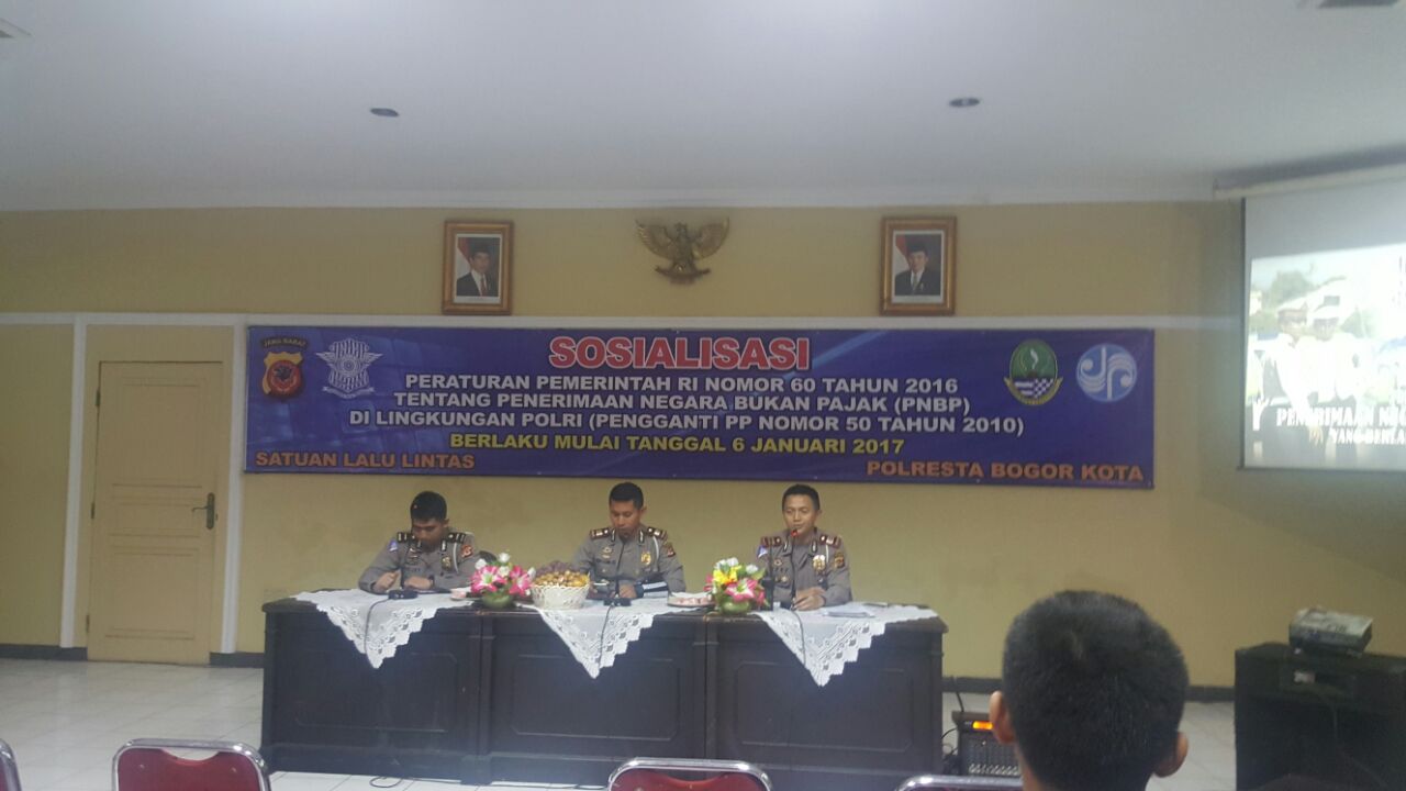 Polresta Bogor Kota – Bertempat di Aula Mapolresta Bogor Kota yang berlokasi di Jl. KS Tubun No. 21 Kota Bogor, pada hari Selasa pagi (3/1), Satuan Lalu Lintas Polresta Bogor Kota menggelar Sosialisasi tentang penerapan Peraturan Pemerintah (PP) Nomor 60 Tahun 2016 tentang Penrimaan Negara Bukan Pajak (PNBP) yang berlaku pada Kepolisian Negara Republik Indonesia (Polri).